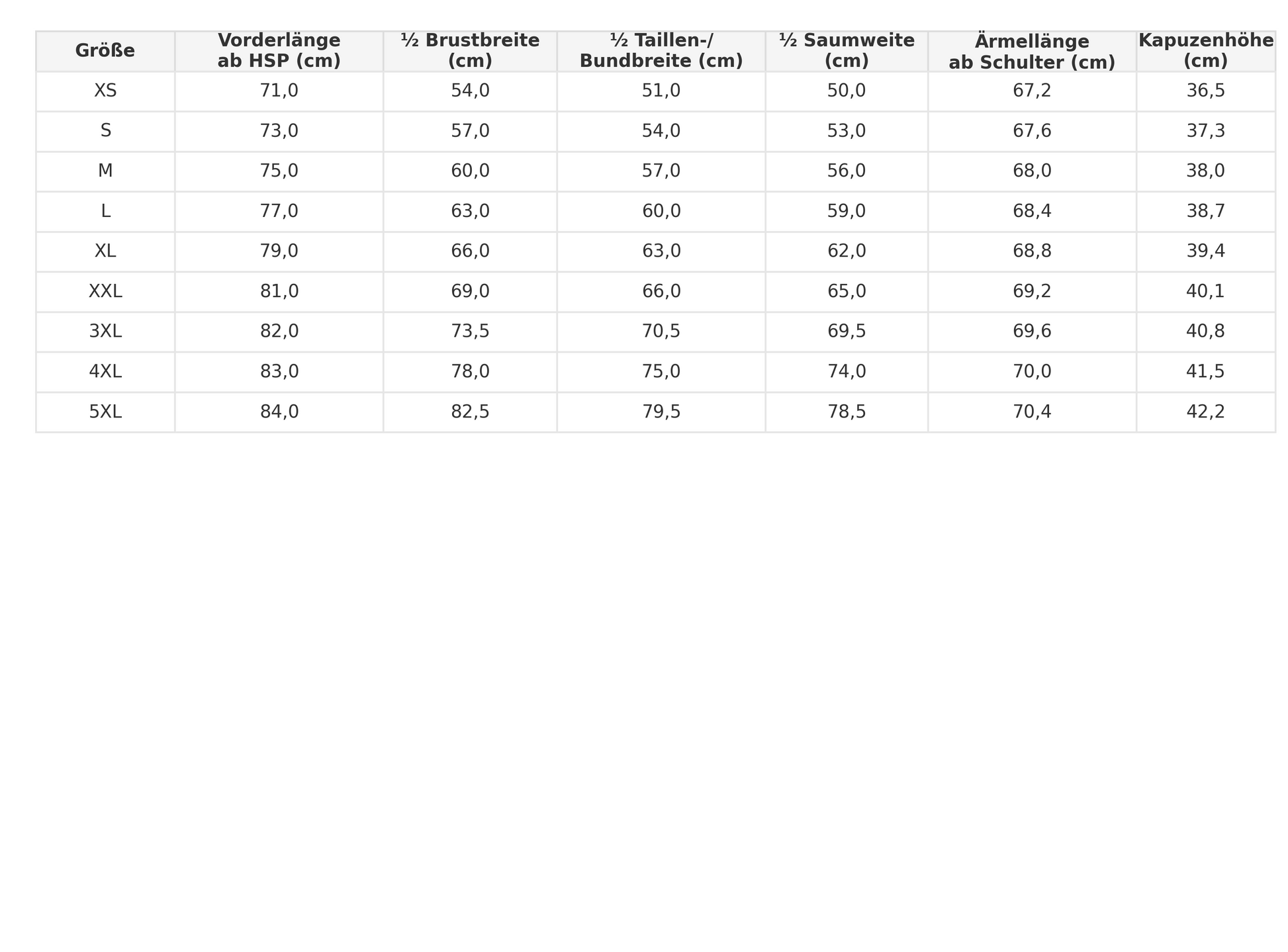 | Größe | Länge (HSP) cm | ½ Brust cm | ½ Taille/Bund cm | ½ Saum cm | Ärmel cm | Kapuzenhöhe cm |